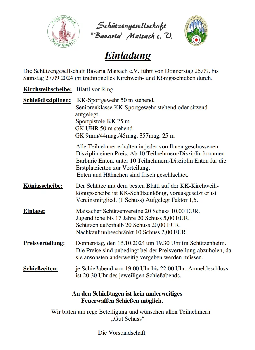 Bei den 29. Offenen Bayerischen Meisterschaften für Traditionswaffen anlässlich des Oktoberfest Landesschießens gingen 6 Titelränge an die SG Bavaria Maisach. Die Erfolge wurden von den Schützen Georg Menter und Fritz Fischer erzielt.